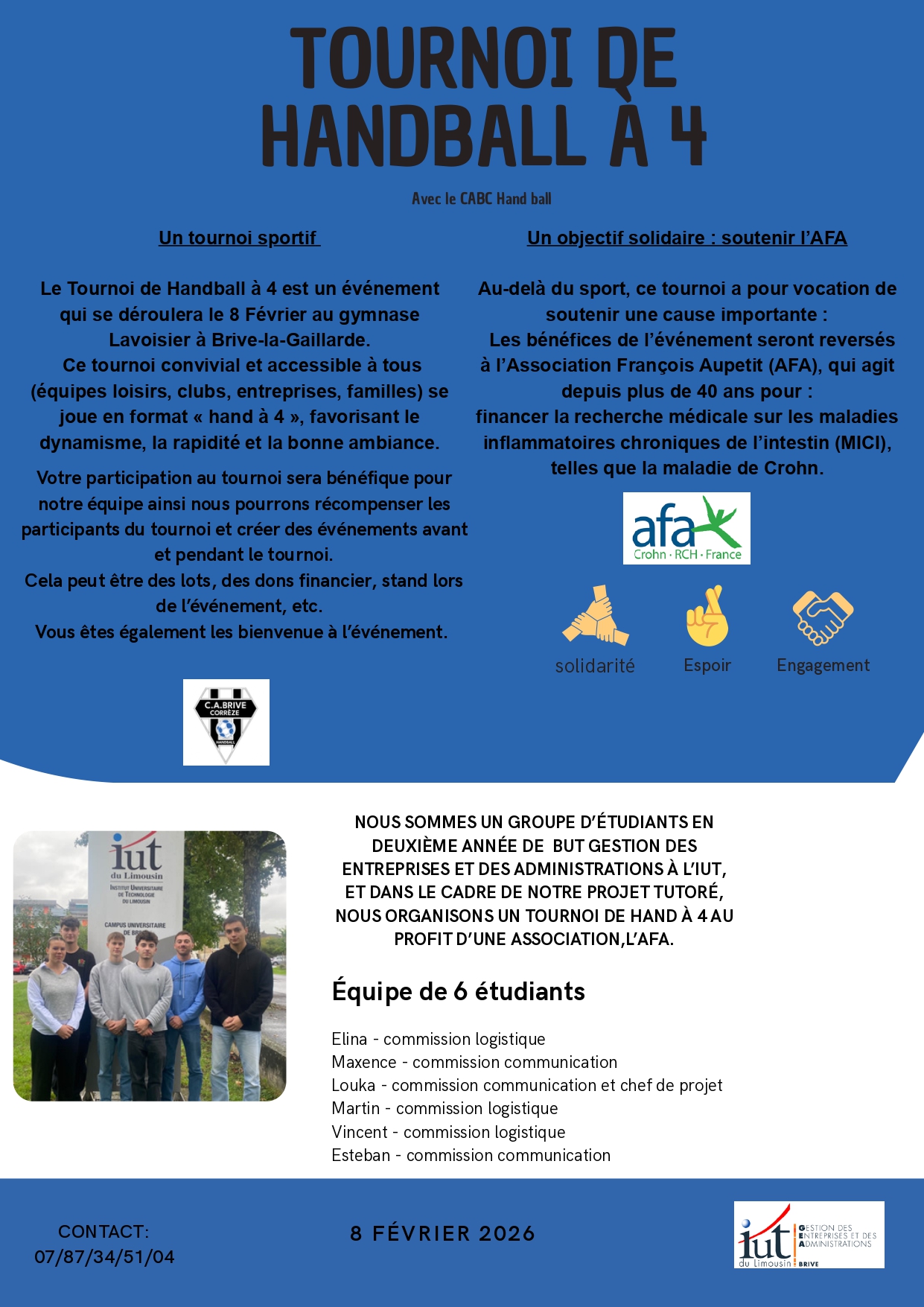 À travers l’organisation de la 3ᵉ édition du Tournoi de Handball à 4, Louka, Elina, Martin, Vincent, Maxence et Esteban ont choisi de mettre le sport au service de la solidarité, au profit de l’afa Crohn RCH France. L’événement se tiendra le 8 février 2026, en collaboration avec le Club de Handball Brive Corrèze, et s’inscrit dans la continuité d’un projet alliant engagement étudiant, sensibilisation et soutien aux personnes concernées par les MICI.