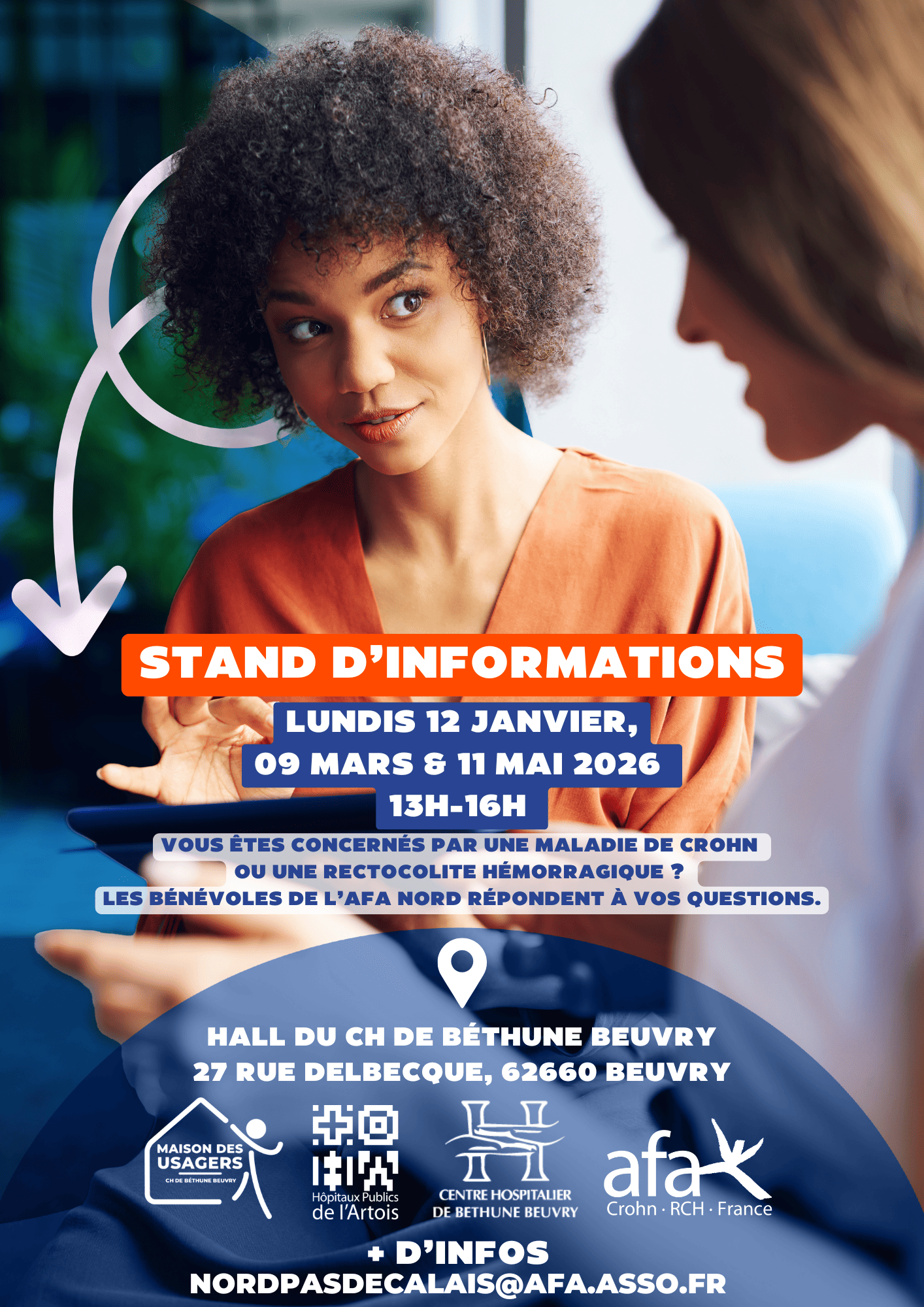 Malade ou proche de malade, les bénévoles de l’afa Hauts-de-France répondent à vos questions lors d’un stand d’informations au sein du Centre hospitalier de Béthune.