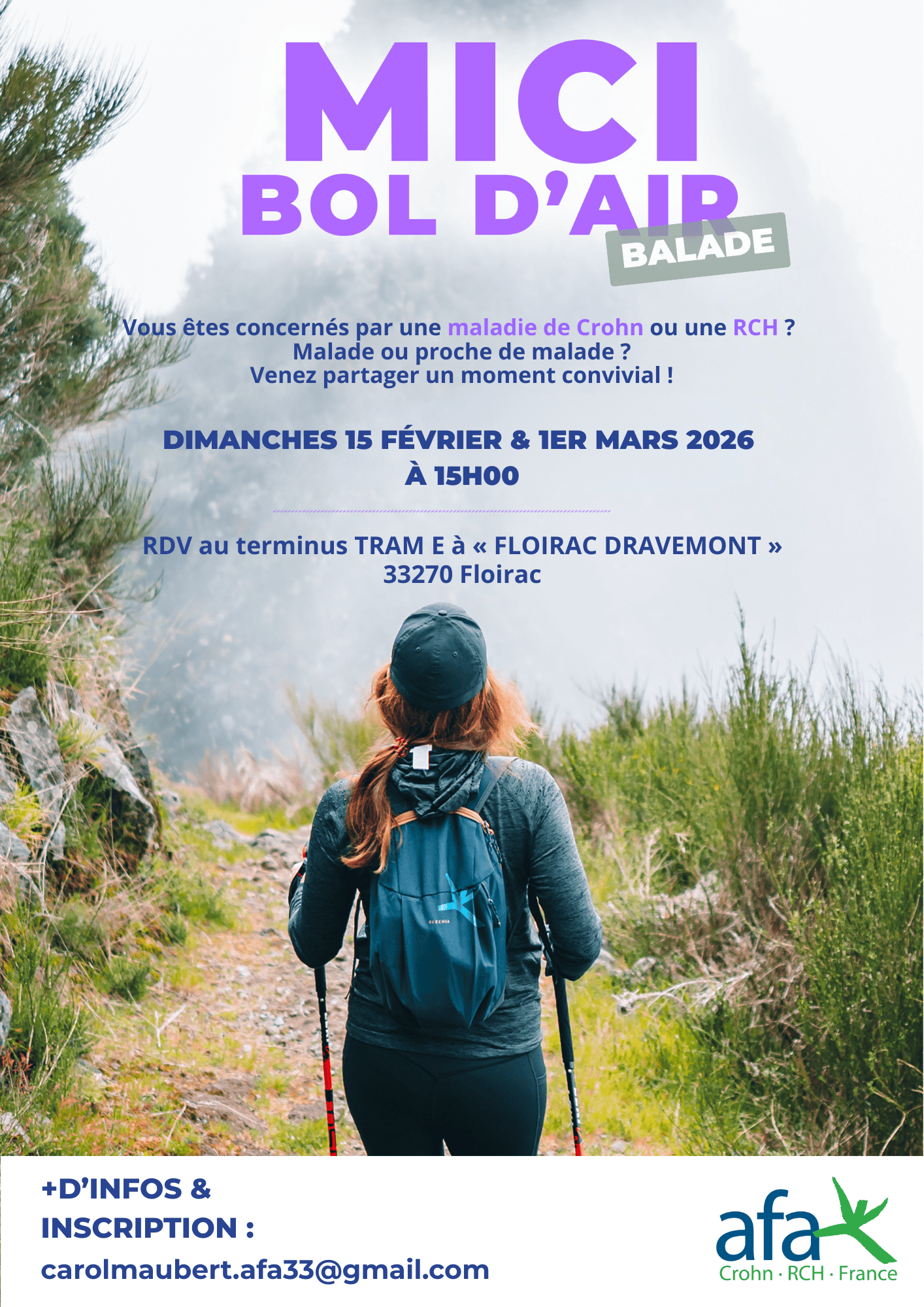 Nous vous invitons à vous inscrire auprès de Carol, bénévole afa 33, dès que possible à carolmaubert.afa33@gmail.com afin de recevoir toutes les informations pratiques concernant la balade et être prévenu en cas de changement.