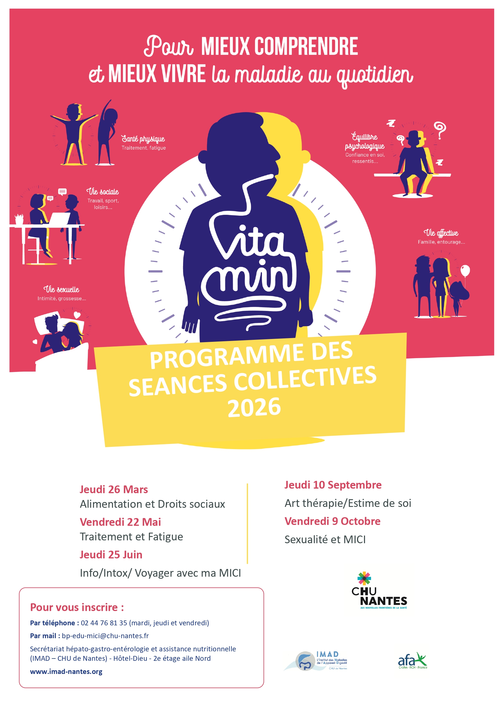 Renseignement et prise de rendez-vous auprès du Secrétariat d’hépato-gastroentérologie et assistance nutritionnelle (IMAD – CHU Nantes) au 02 44 76 81 35 (mardi, jeudi et vendredi) ou par mail à bp-edu-mici@chu-nantes.fr