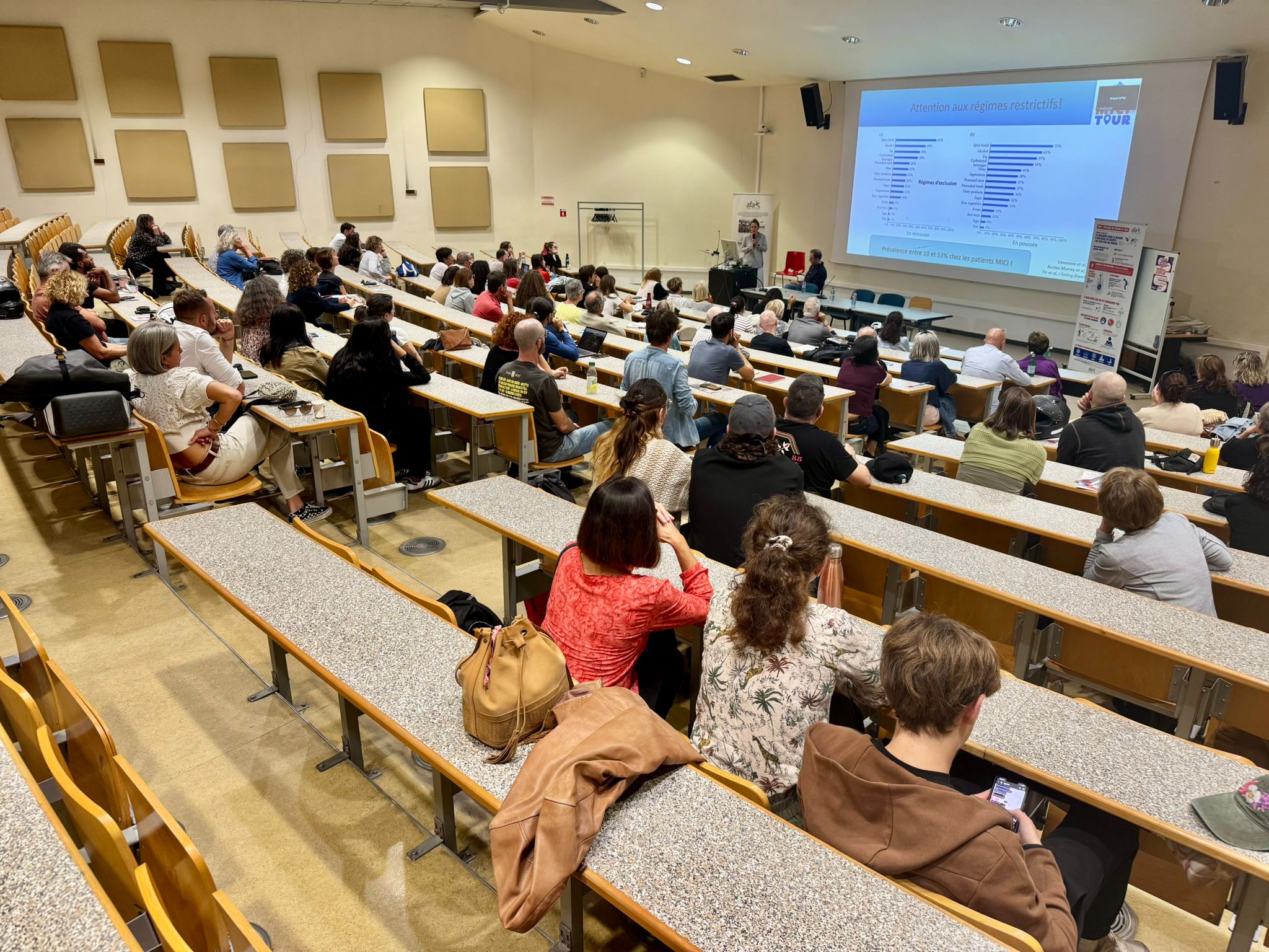 Trois des gastro-entérologues, spécialistes en MICI du Pôle digestif du CHU St. Eloi et de la Clinique Beausoleil à Montpellier, ont accepté de parler aux 80 patients, proches et professionnels de santé, venus des départements du Languedoc-Roussillon. Jean-David Bost, directeur adjoint, Vie associative de l’afa, assisté de Madeleine Duboé, adhérente de l’afa et patient partenaire auprès de l’équipe ETP à l’hôpital, et des quelques bénévoles locaux, ont organisé avec succès cette première rencontre depuis longtemps.